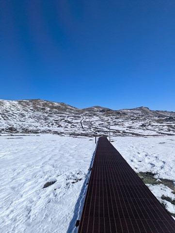 A 13km return walk from the Eagles Nest Restaurant (at the top of the Kosciuszko Chairlift). It's a pretty straightforward forward walk to the highest point in Australia. The track is easy to find and follow. It's a relatively general incline to the top, only moderate fitness required.