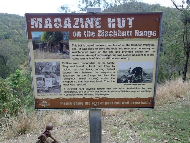 The Benarkin to Linville section is 18km, downhill. The only inclines are crossings of Blackbutt Creek. Initially the walk is through gum forest, with stands of hoop pine and stands of silky oak. Then it opens up and runs through farm land for the last 4 or 5 km. There are plenty of birds, notably many brown doves, and flocks of quail. There is a bellbird colony near 130 kilometric mark. Blackbutt is a pretty creek if running. There is a bit of rainforest on the banks. Historical railway spots and information are signed and very interesting. Surface is good - no slippery bits. There are three shelters along the way. MacNamara's Camp. about half way, has a toilet and water tank. Take your own water. And maybe insect repellent.