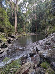 This track branches off the Illinbah circuit and descends through open forest and rainforest to Gwongoorool Pool on the Coomera River. Return via same track. (Illinbah circuit commences at the car park near the information centre).